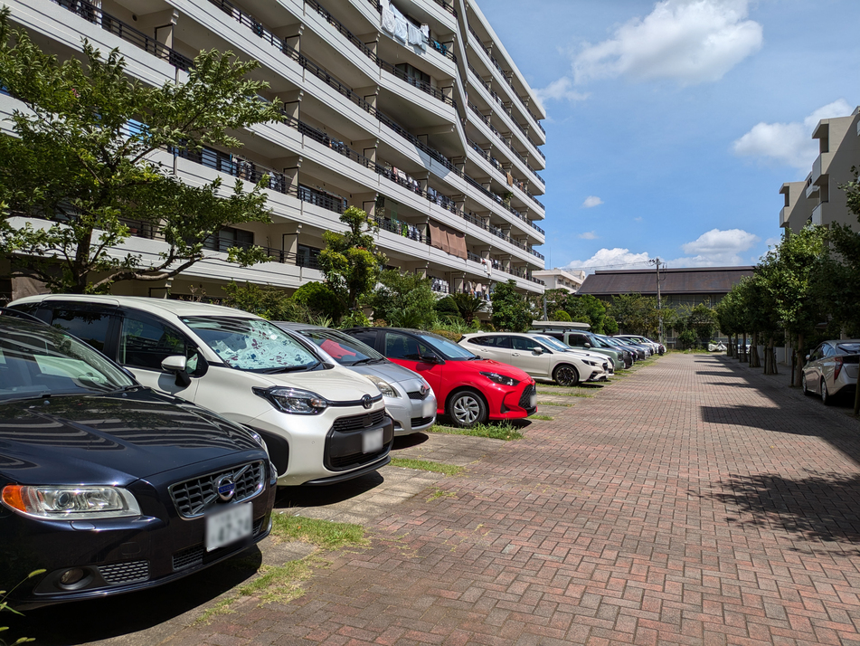 総戸数152戸のビックコミュニティ(弐番街) 団地ならではの棟間隔のとれた敷地、緑豊かで・日当たり良好です 1戸につき1台駐車場無料!